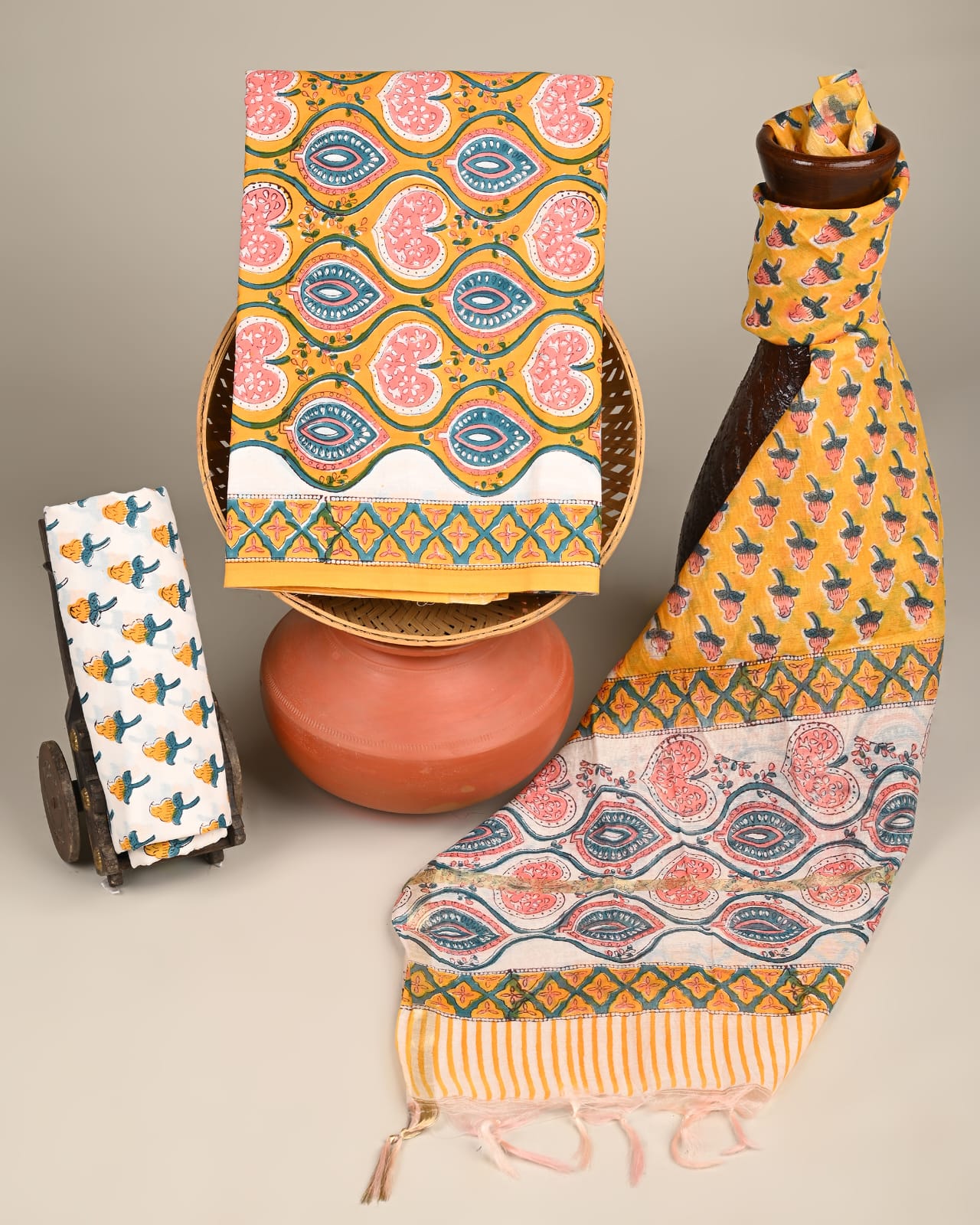 Cotton Dress Material with Chanderi Dupatta –3pc Wholesale Handblock Printed MOQ 6 Pcs Assorted Designs | Fabtexs